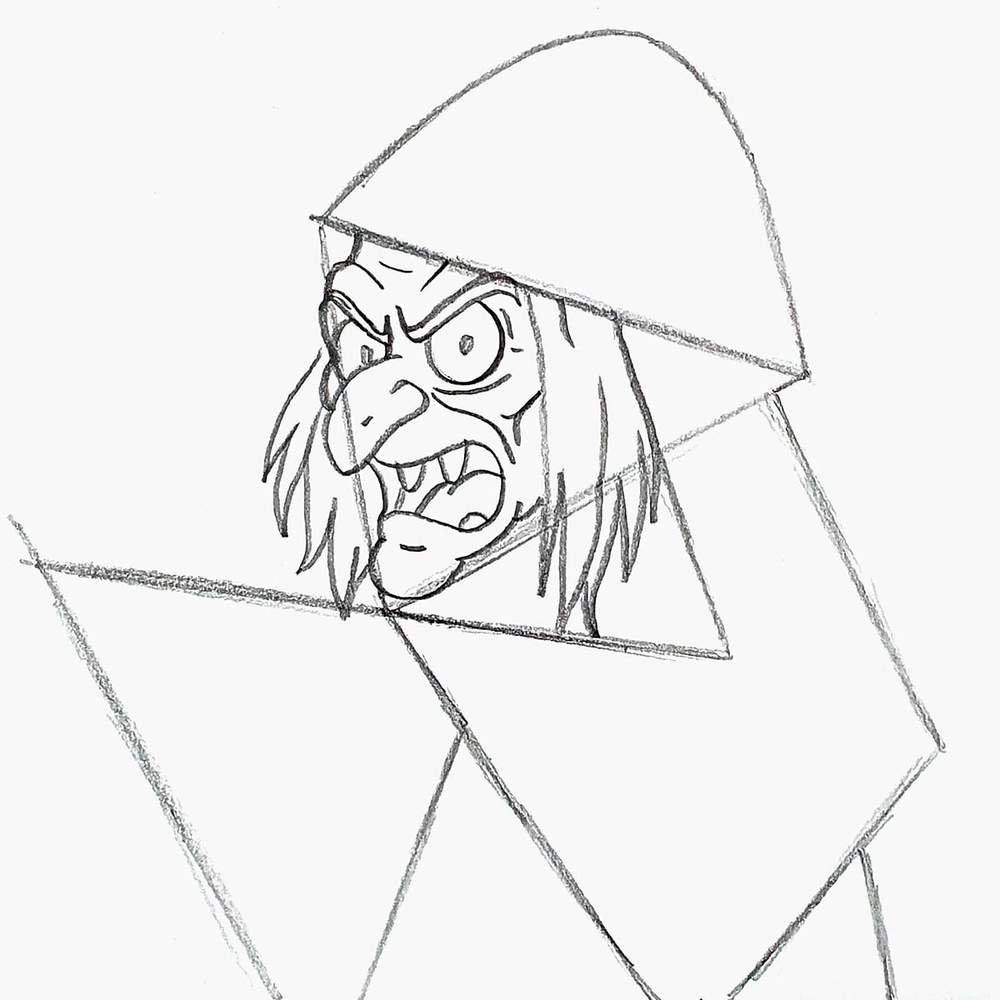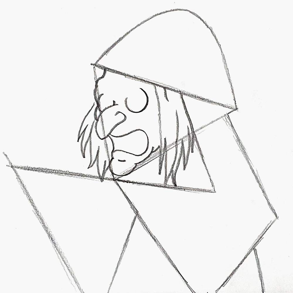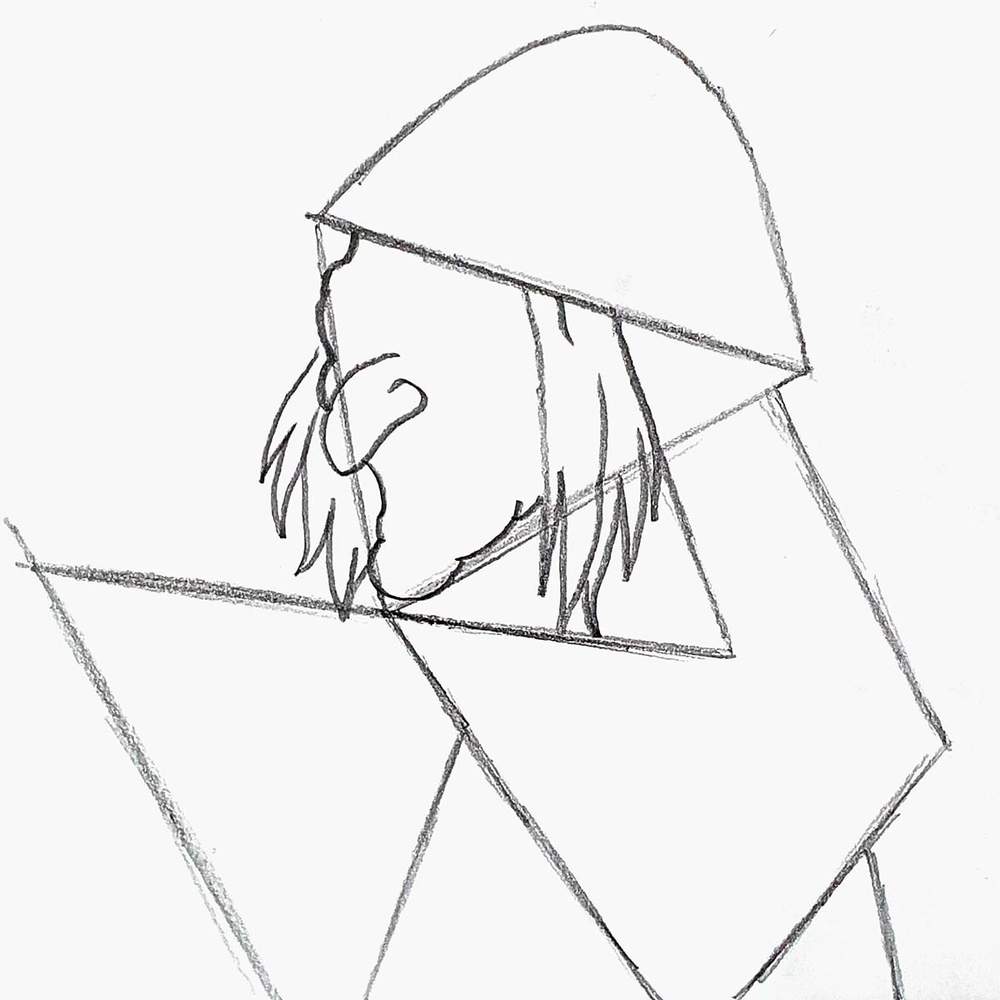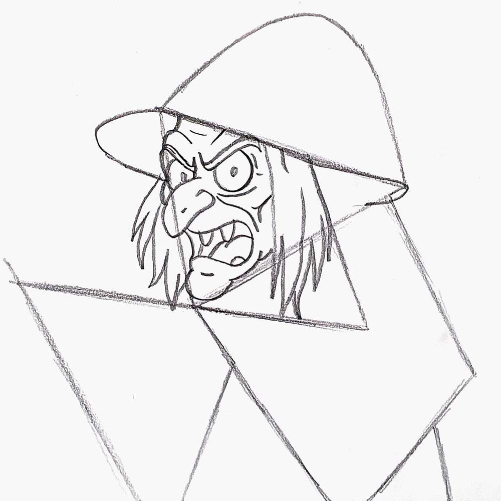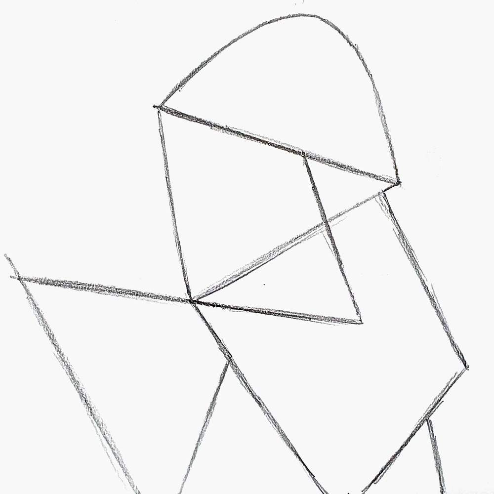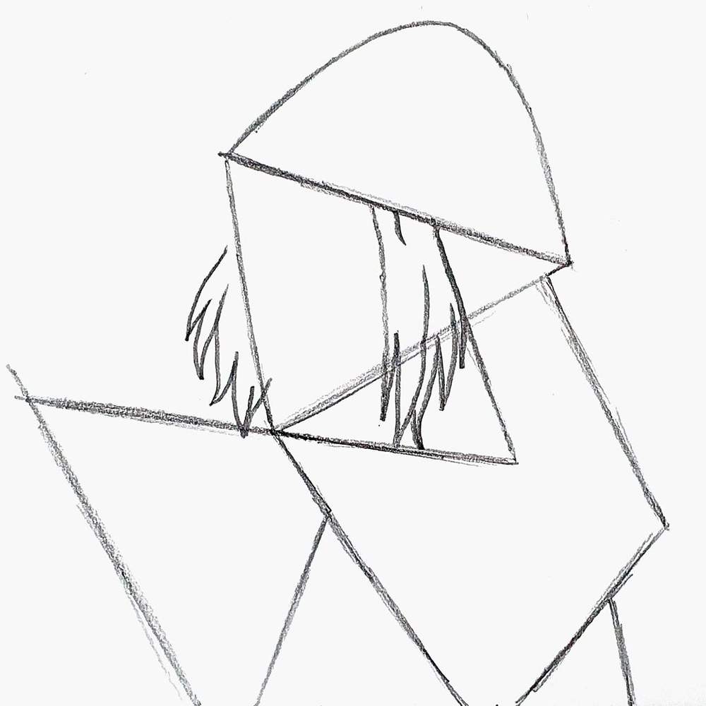 Then, I added a big arch on top for the hat and sketched two sides of a triangle overlapping the first one on the right.