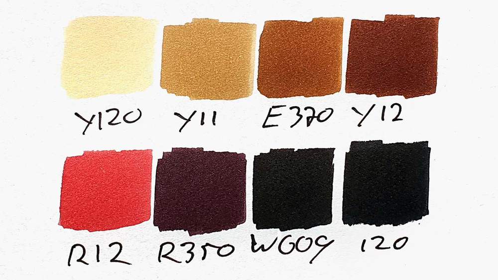 To make this drawing, I used Ohuhu Honolulu markers in the colors Buttercup Yellow (Y120), Brown Grey (Y11), Light Walnut (E370), Mahogany (Y12), Rose Buvard (R12), Dark Purple Grey (R350), Warm Grey 9 (WG09), and Black (120).