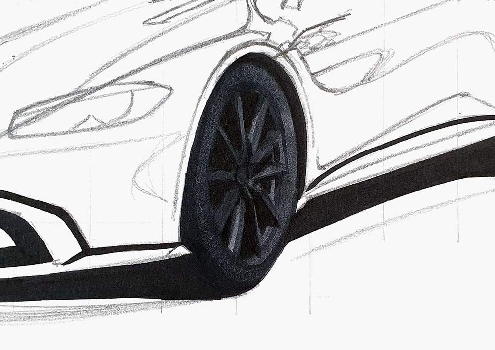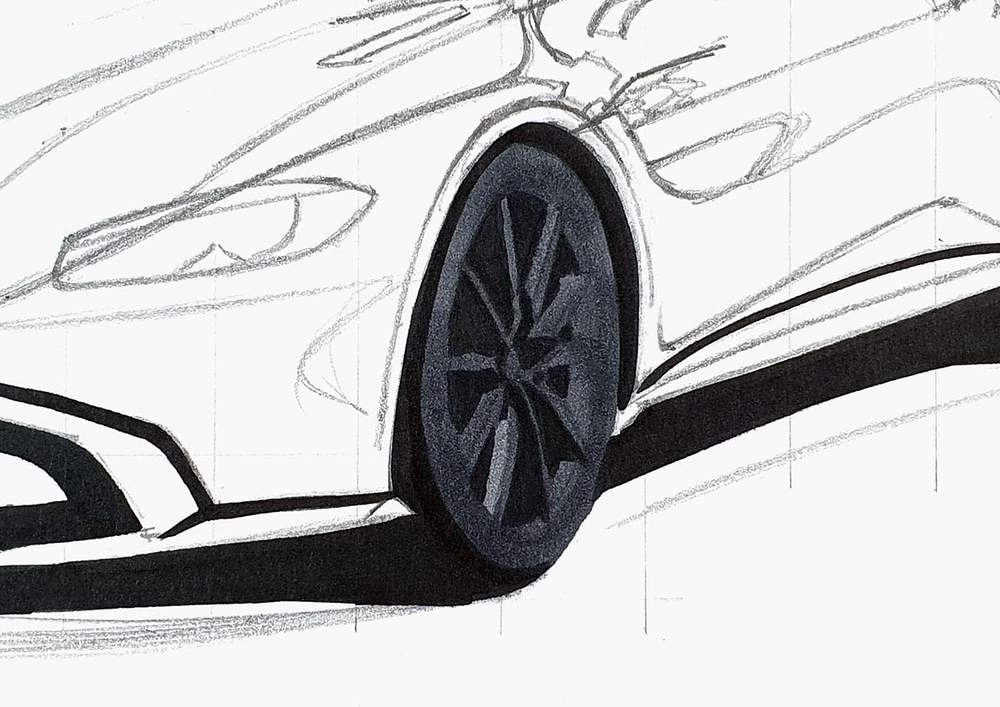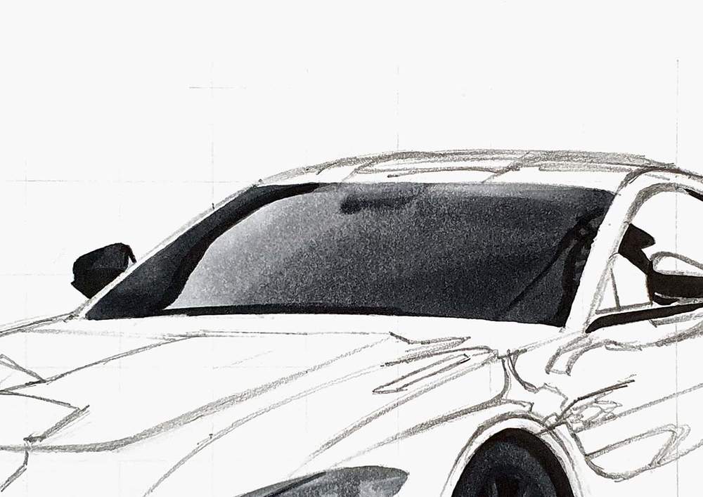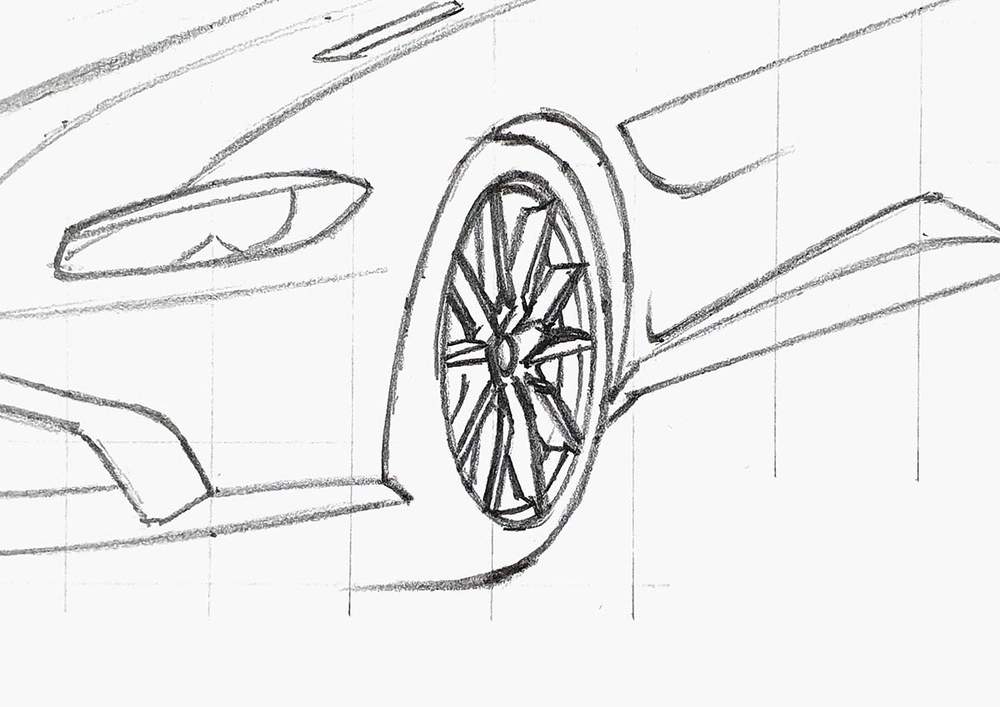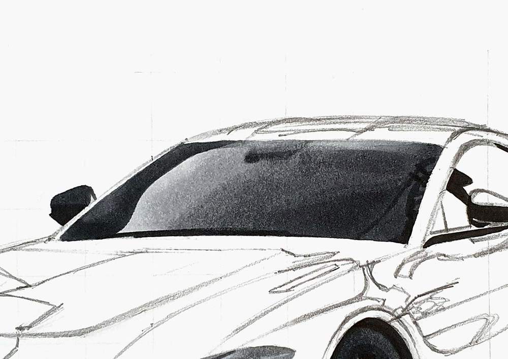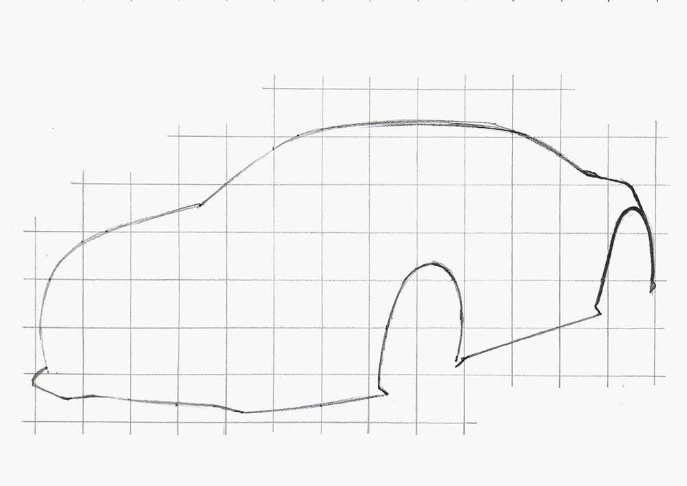 When sketching a car, I like to draw the full outline first and then add the parts and details.