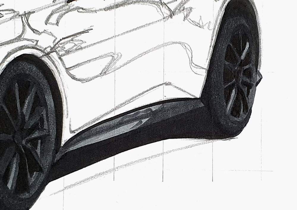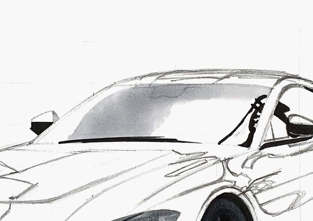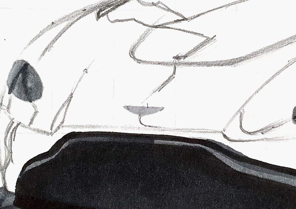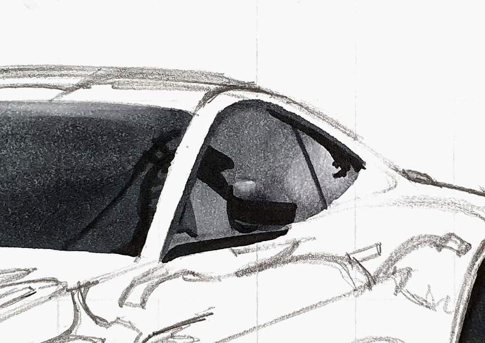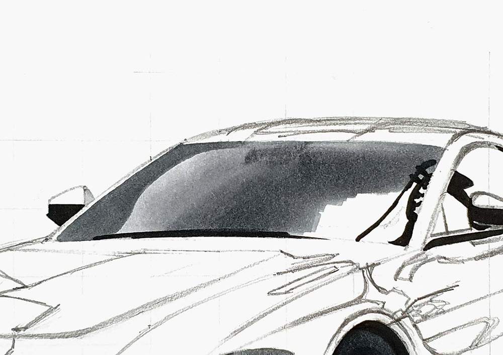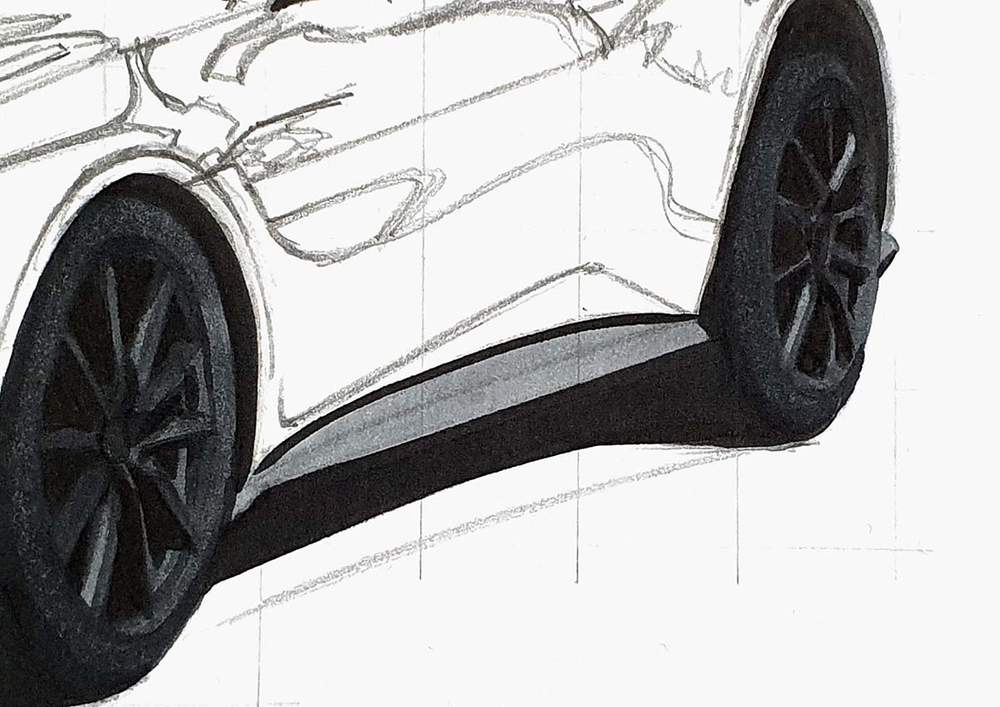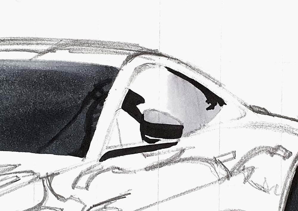 When sketching a car, I like to draw the full outline first and then add the parts and details.