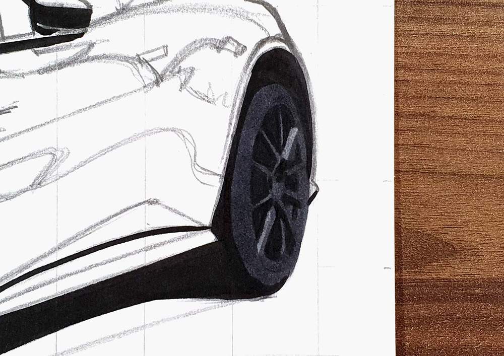 I always like to color all the black parts of the car first. This is super easy to do and makes the drawing look a lot less daunting in my opinion.