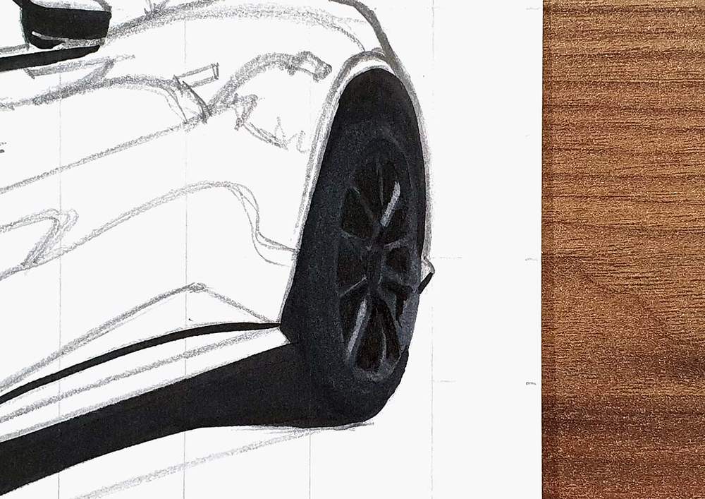 I used the white pencil to add highlights and details to the wheels and the headlights, and I used it to add the door gaps.