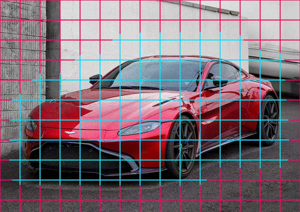 I then added a grid overlay and marked the squares that contain parts of the Aston Martin with light blue.