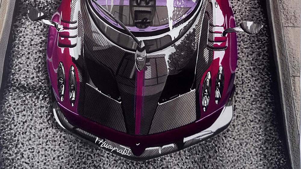 This is exactly what I did when drawing this Pagani Huayra BC Roadster. I first colored all visible carbon with several grey-toned markers and then I added the carbon fiber lines all over the car using a black fineliner for the dark lines and a grey fineliner for the lighter parts.