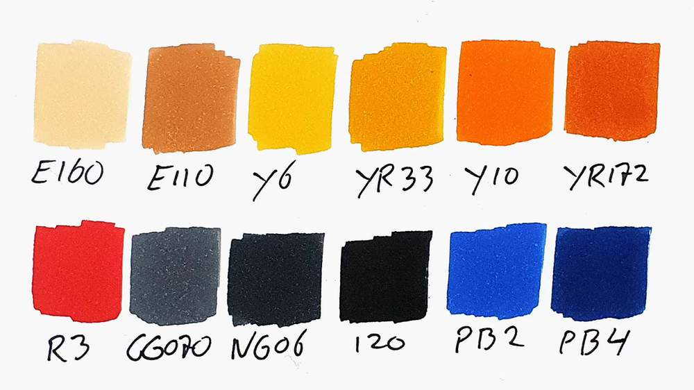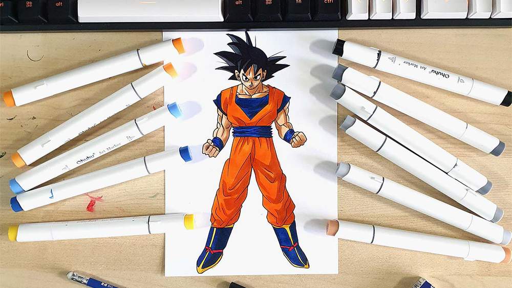 To make this Goku drawing, I used Ohuhu Honolulu markers in the colors Soft Sun (E160), Dark Suntan (E110), Lemon Yellow (Y6), Melon Yellow (YR33), Apricot (Y10), Tiger Lily (YR172), Coral Red (R3), Neutral Grey 07 (CG070), Neutral Grey 6 (NG06), Black (120), Brilliant Blue (PB2), and Napoleon Blue (PB4).