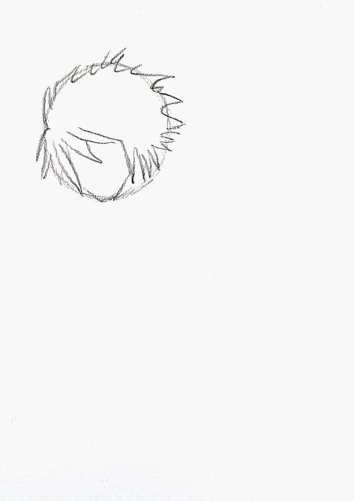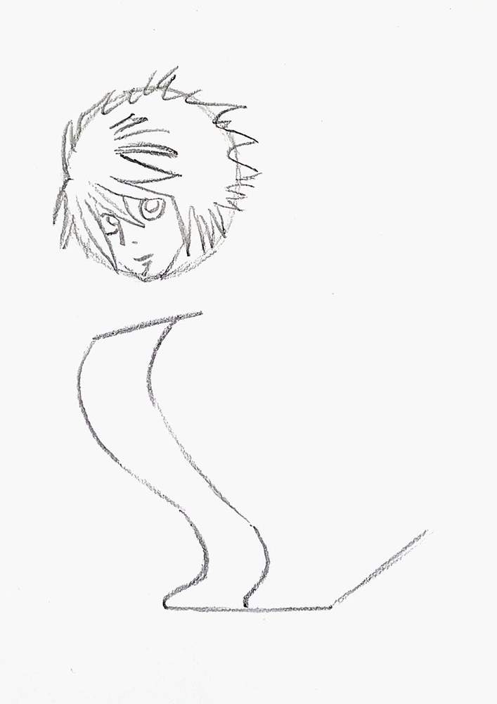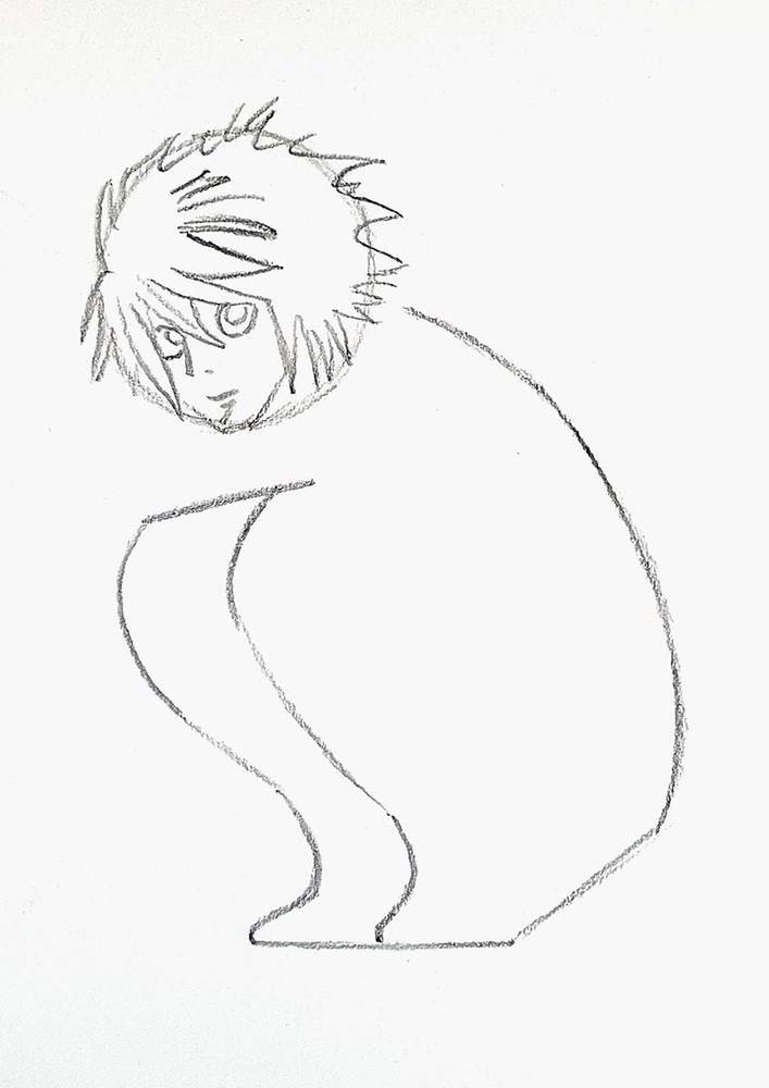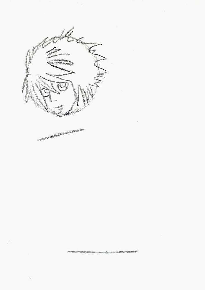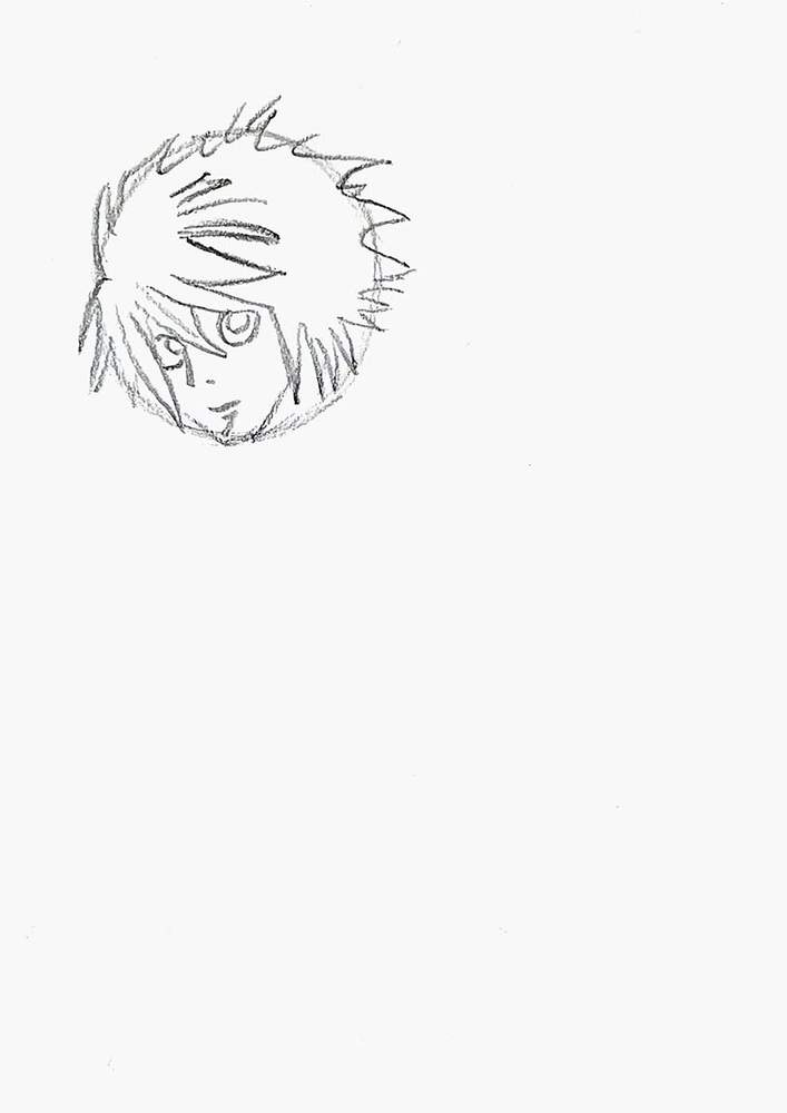 Next, I sketched L's wild and pointy hair, and I sketched his chin and jawline on the bottom.