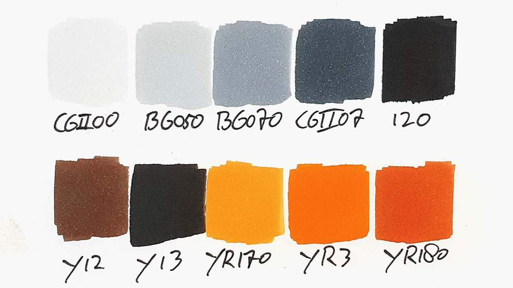 To make this drawing of Olaf, I used Ohuhu Honolulu markers in the colors Cool Grey II 0 (CGII00), Cool Grey 05 (BG050), Cool Grey 07 (BG070), Cool Grey II 07 (CGII07), Black (120), Mahogany (Y12), Chestnut Brown (Y13), Chrome Orange (YR170), Orange (YR3), and Lipstick Orange (YR180).