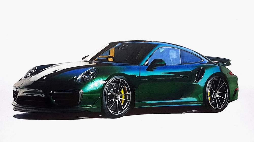This Porsche 992 GT3 I drew contains mostly curves flowing into each other. With a car with such a curvy body, it's more difficult to predict how the reflections look and where to draw the horizon line.