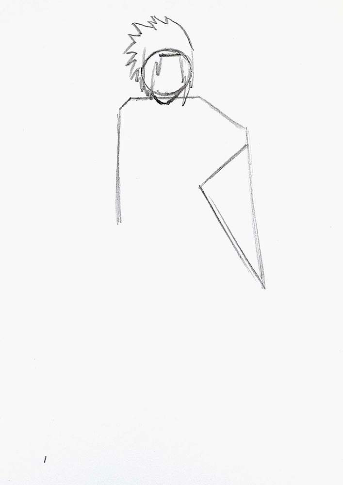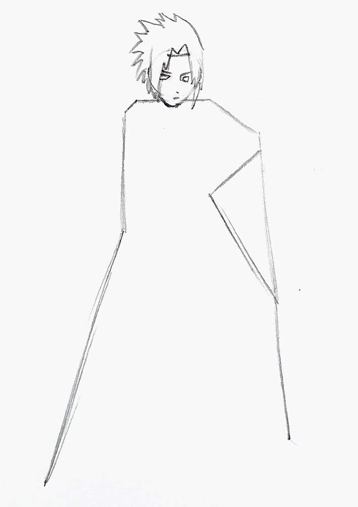 Next, I sketched the basic outline of Sasuke's body, starting with a vertical line down from his right shoulder (on the left) and a short vertical line from his left arm (on the right).