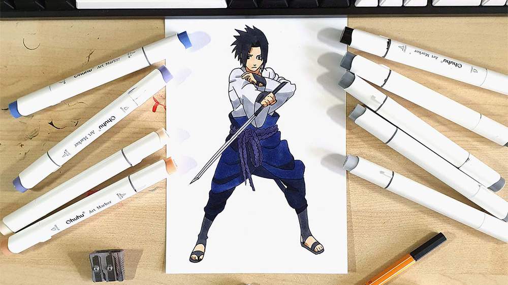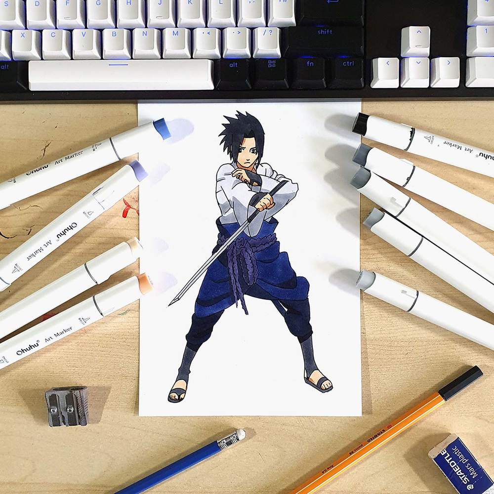 To prepare the sketch of Sasuke for coloring, I like to outline it first with a black fineliner.