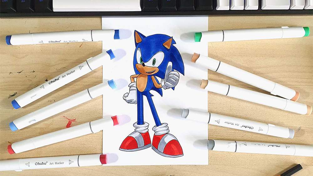 To make this Sonic drawing, I used Ohuhu Honolulu markers in the colors Neutral Grey 02 (CG020), Neutral Grey 05 (CG050), Rouge Orange (Y5), Coral Red (R3), Geranium (R8), Sand (E220), Dark Suntan (E110), Ocean Green (G3), Brilliant Blue (PB2), Cobalt Blue (PB3), and Black (120).