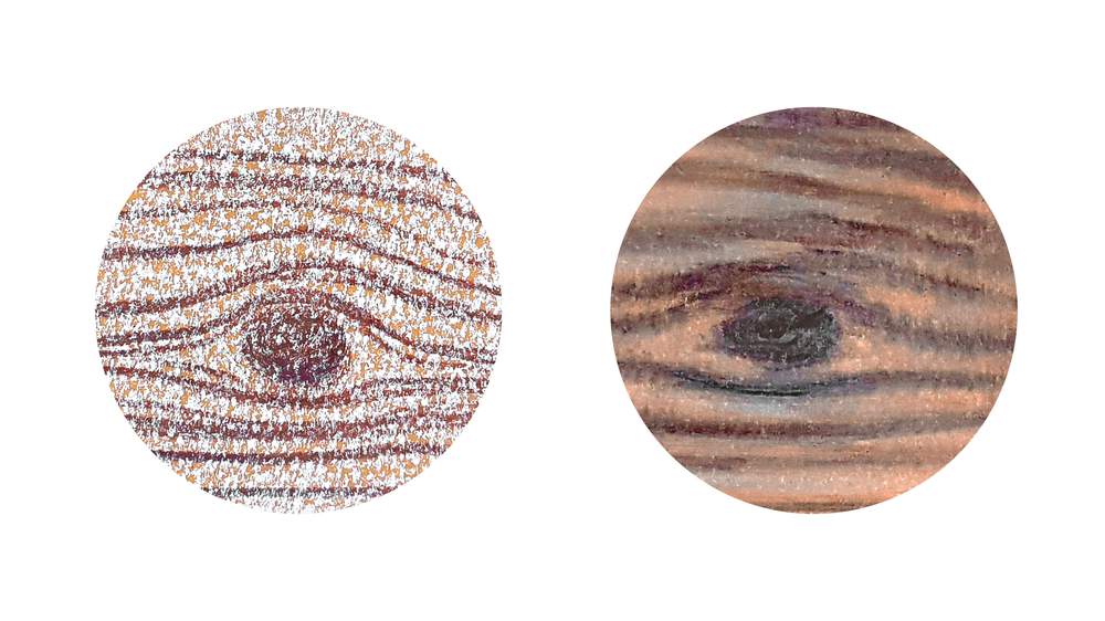 Now you can indicate where the grain is with the same darker brown pencil. Keep in mind that the knots kind of push the grain away, making them curve around the knots and squeezing them a bit.