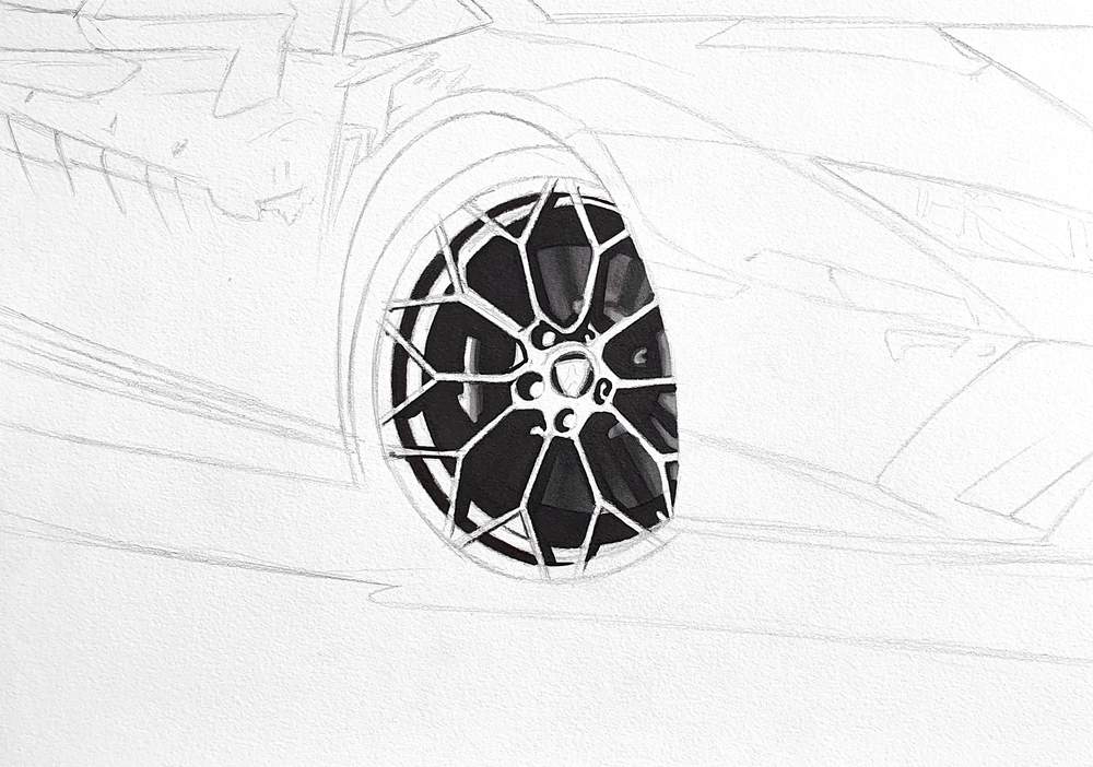 Wheels can look very complicated and overwhelming. But luckily most wheels are for a big part black. So to make it a lot less complicated you just color all black parts black with a black marker. But before you do that it's better to first outline those black parts with a fineliner, like I've done below. This will make it a lot easier to color those parts black in the next step. By outlining you decrease the chance of accidently going over parts you didn't want to be black.