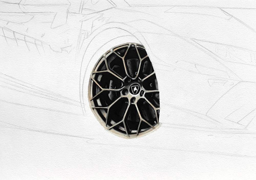 Once you colored the tire with markers you can to color the whole tire with colored pencils. Now it's time to add the details and make the tire the right shade. Most of the time the tire has a narrow black circle at the inside, closest to the rim.