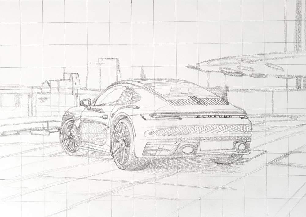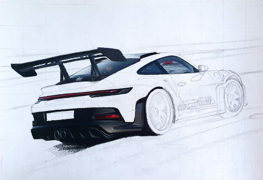 Yet again I started a drawing of a Porsche, but this time the new GT3 RS. I hadn't been on Instagram for a long time, but when I logged in again I saw a photo of the new Porsche 992 GT3 RS and I decided to draw it. And of course I chose to draw a difficult photo with a background.
