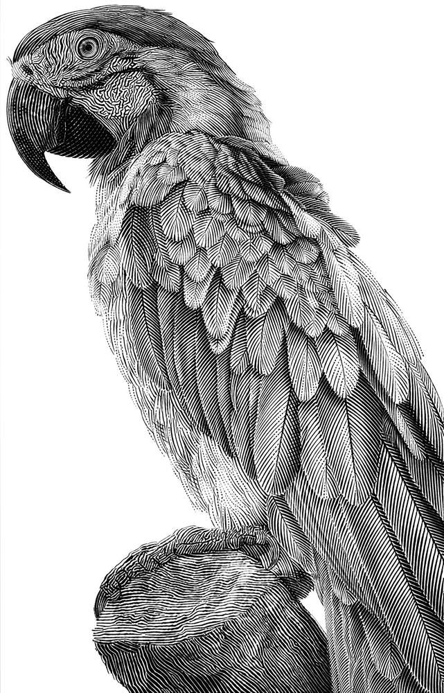The feather texture in these drawings is amazing. It just contains many, many parallel lines, some thicker and closer together than other which makes some areas look darker. This whole drawing actually consists of many lines following the surface of every shape to give it its shape. It looks really good!