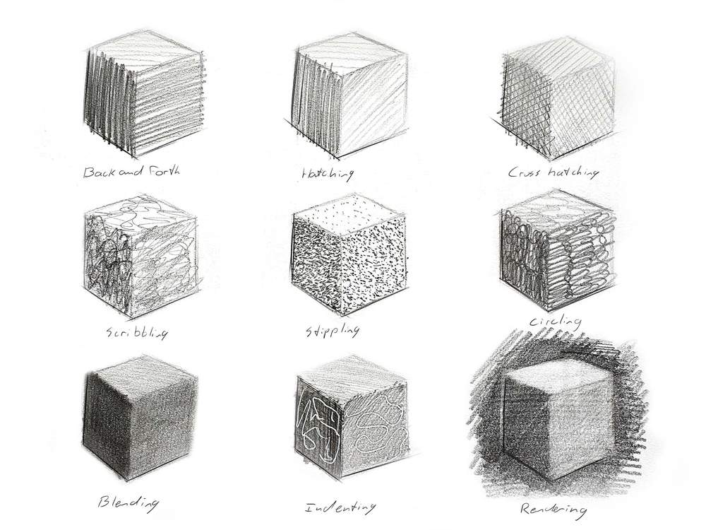 Shading Techniques: Different shading techniques like hatching, cross-hatching, and blending can be used to show form.