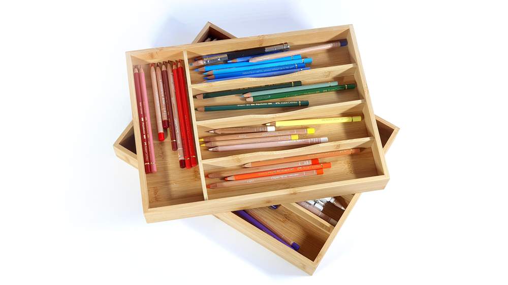 Trays with compartments can be labeled with the color or brand of pencils they contain, keeping your pencils organized and easy to access. You can find trays specifically designed for colored pencils, or repurpose a tray from another product.