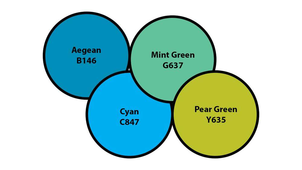 Aegean (B146) → Cyan (C847) → Mint Green (G637) → Pear Green (Y635)