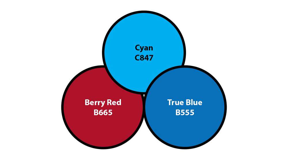 Berry Red (R665), Cyan (C847), True Blue (B555)