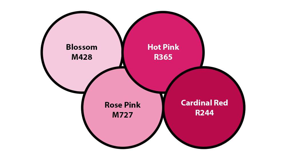 Blossom (M428) → Rose Pink (M727) → Hot Pink (R365) → Cardinal Red (R244)
