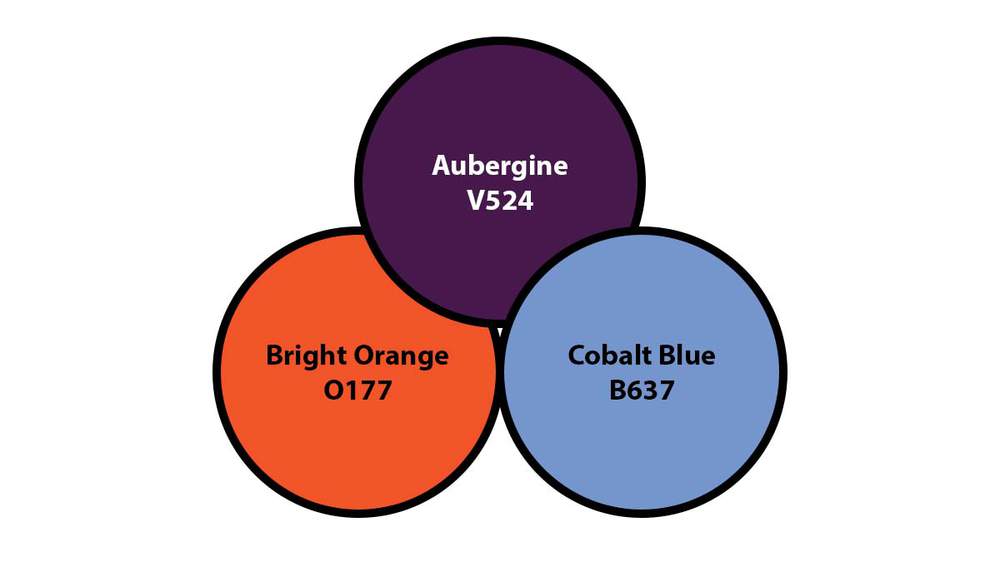 Bright Orange (O177), Aubergine (V524), Cobalt Blue (B637)