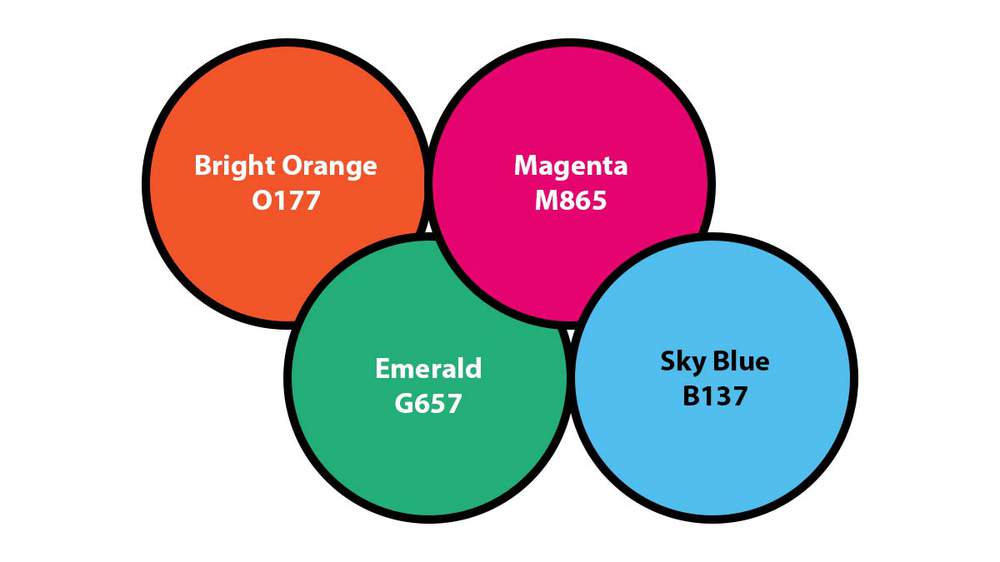 Bright Orange (O177), Emerald (G657), Magenta (M865), Sky Blue (B137)