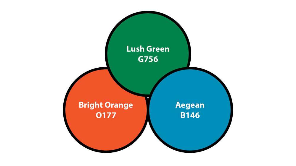Bright Orange (O177), Lush Green (G756), Aegean (B146)