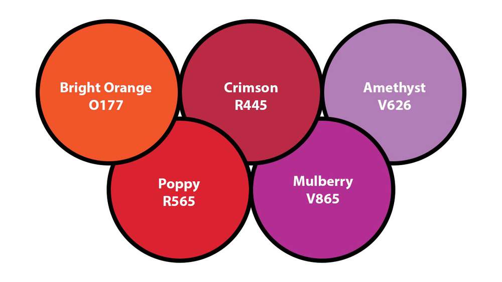 Bright Orange (O177) → Poppy (R565) → Crimson (R445) → Mulberry (V865) → Amethyst (V626)