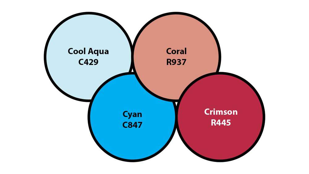 Cool Aqua (C429), Cyan (C847), Coral (R937), Crimson (R445)