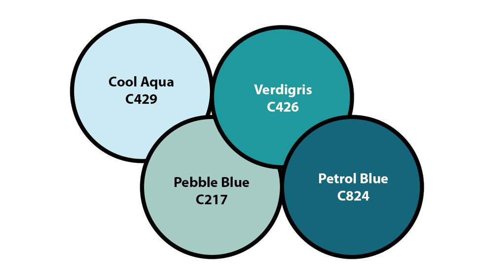 Cool Aqua (C429) → Pebble Blue (C217) → Verdigris (C426) → Petrol Blue (C824)
