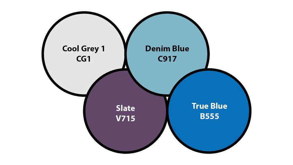 Cool Grey 1 (CG1) → Slate (V715) → Denim Blue (C917) → True Blue (B555)