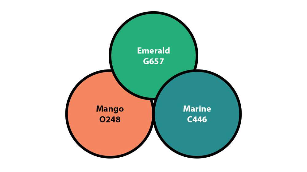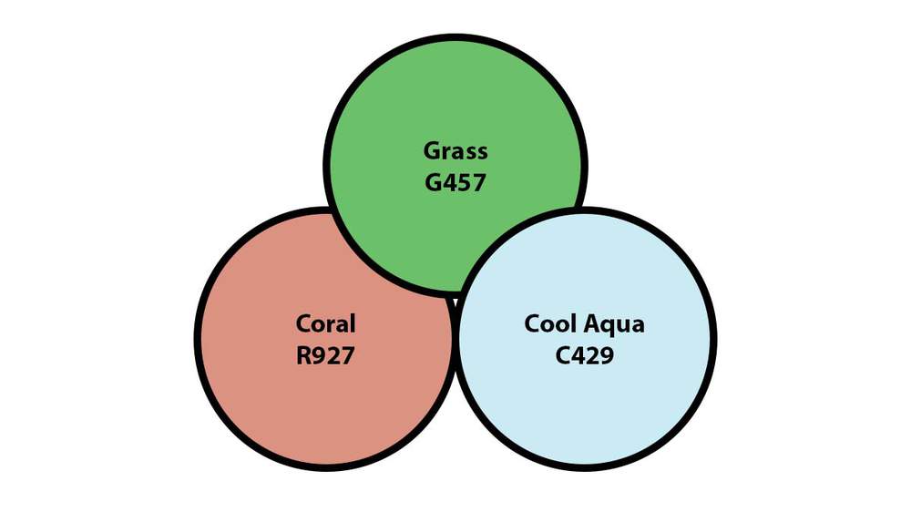Coral (R937), Grass (G457), Cool Aqua (C429)