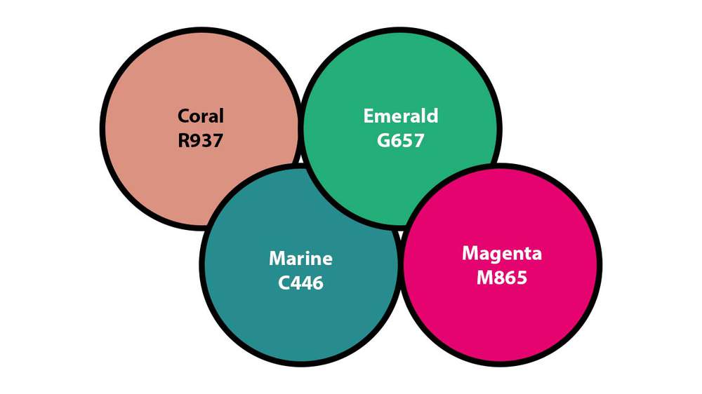 Coral (R937), Marine (C446), Emerald (G657), Magenta (M865)