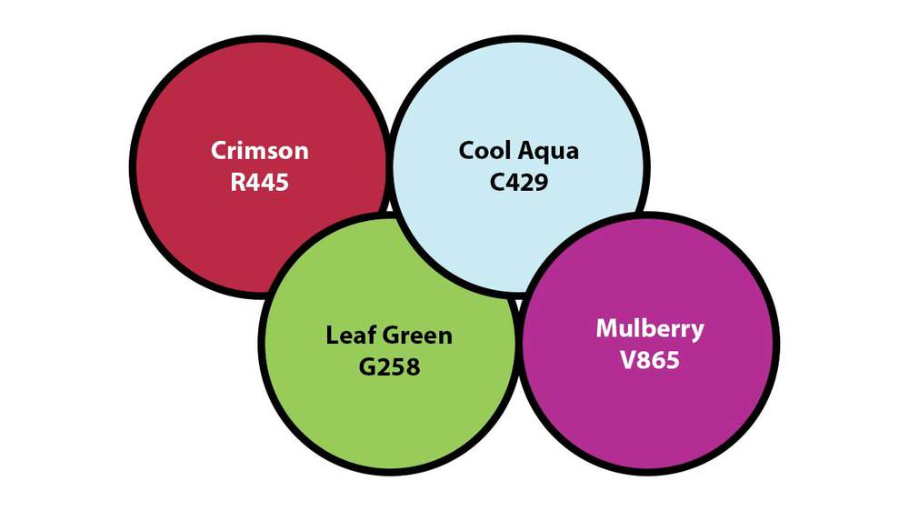 Crimson (R445), Leaf Green (G258), Cool Aqua (C429), Mulberry (V865)