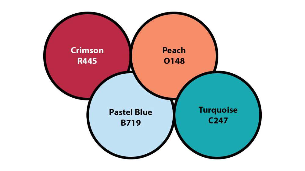 Crimson (R445), Pastel Blue (C719), Peach (O148), Turquoise (C247)