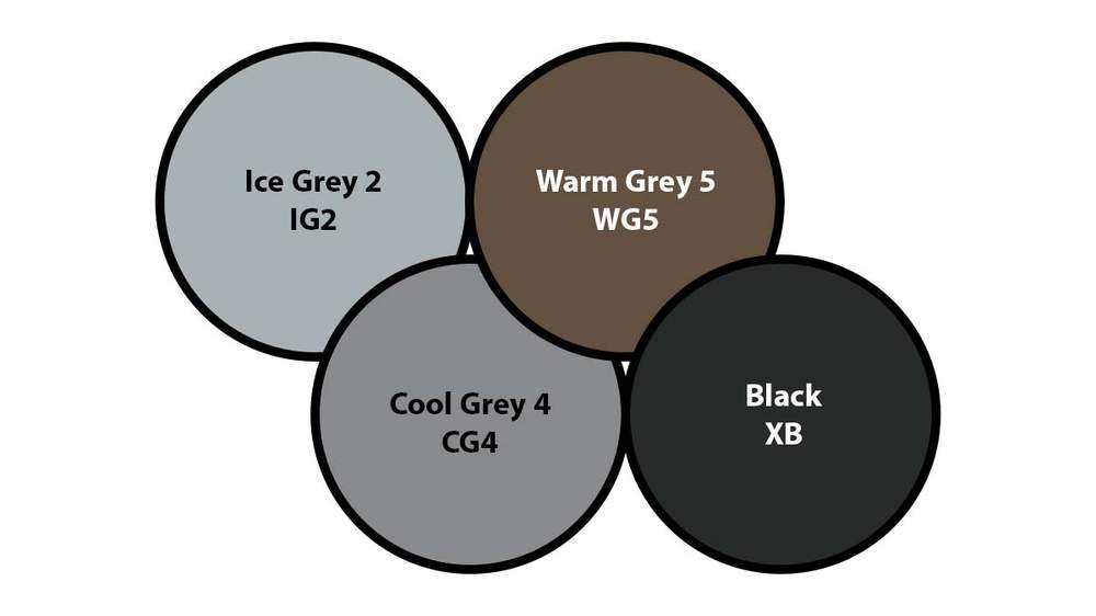 Ice Grey 2 (IG2) → Cool Grey 4 (CG4) → Warm Grey 5 (WG5) → Black (XB)