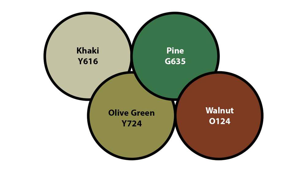 Khaki (Y616) → Olive Green (Y724) → Pine (G635) → Walnut (O124)