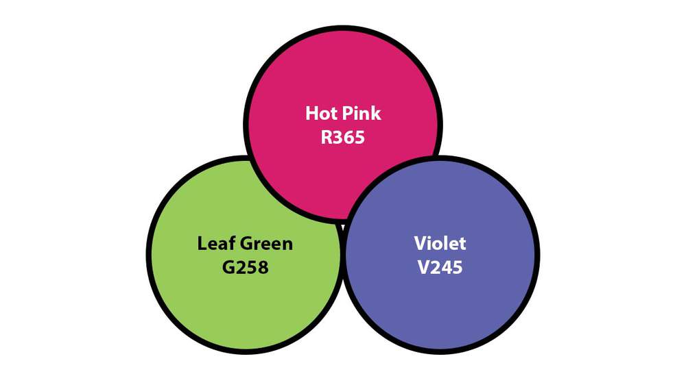 Leaf Green (G258), Hot Pink (R365), Violet (V245)