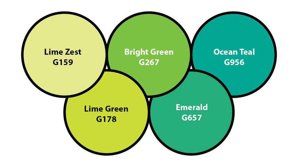 Lime Zest (G159) → Lime Green (G178) → Bright Green (G267) → Emerald (G657) → Ocean Teal (G956)