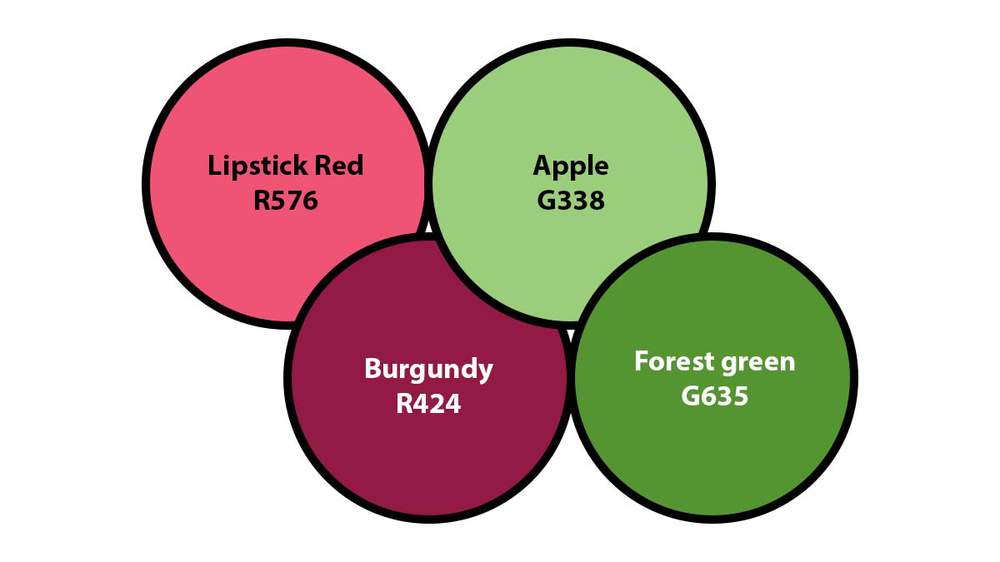Lipstick Red (R576), Burgundy (R424), Apple (G338), Forest Green (G356)