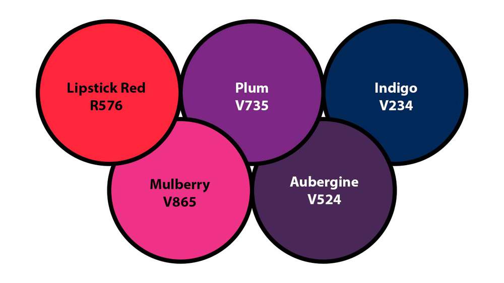Lipstick Red (R576) → Mulberry (V865) → Plum (V735) → Aubergine (V524) → Indigo (V234)