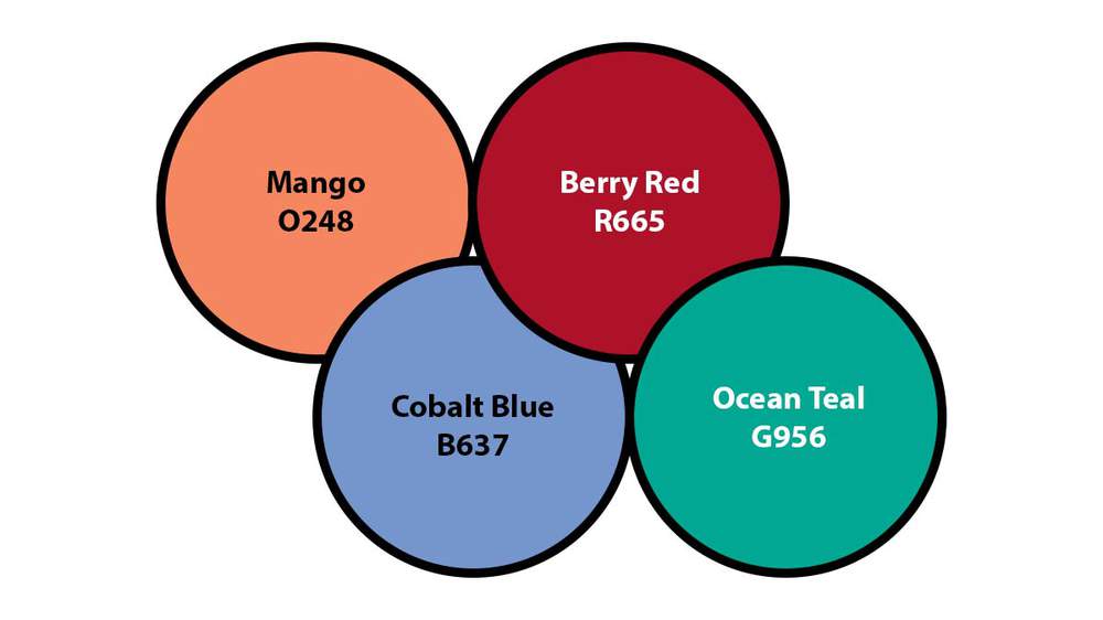 Mango (O248), Cobalt Blue (B637), Berry Red (R665), Ocean Teal (G956)
