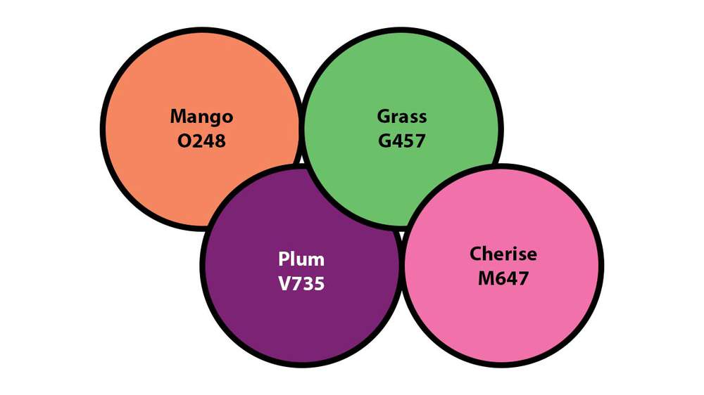 Mango (O248), Plum (V735), Grass (G457), Cerise (M647)