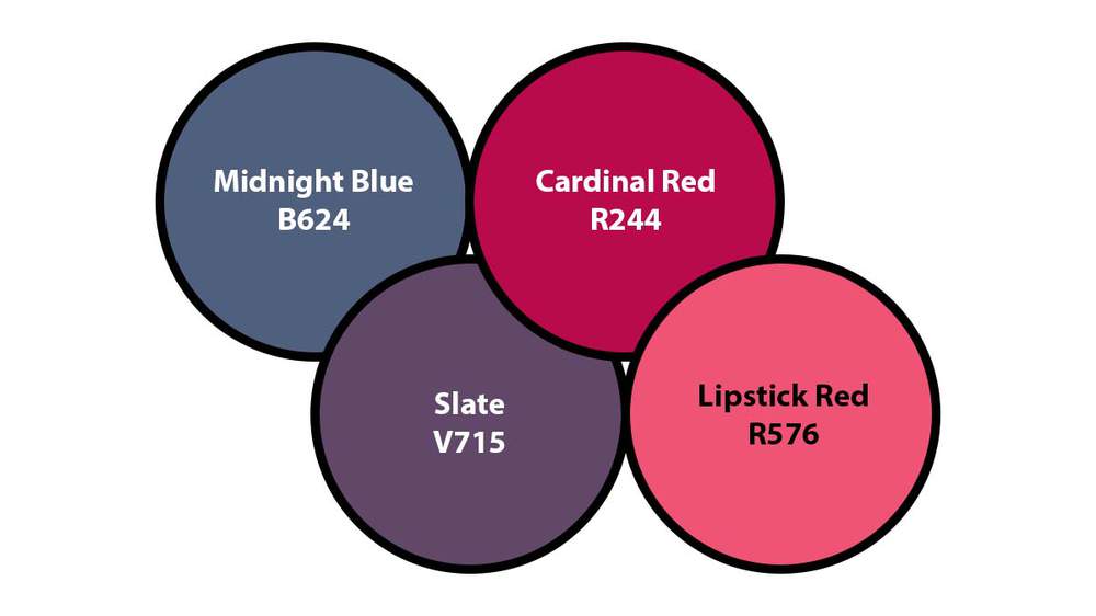 Midnight Blue (B624) → Slate (V715) → Cardinal Red (R244) → Lipstick Red (R576)