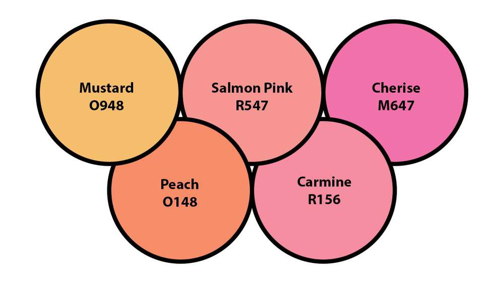 Mustard (O948) → Peach (O148) → Salmon Pink (R547) → Carmine (R156) → Cherise (M647)