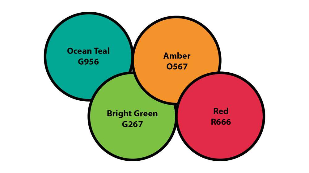 Ocean Teal (G956) → Bright Green (G267) → Amber (O567) → Red (R666)