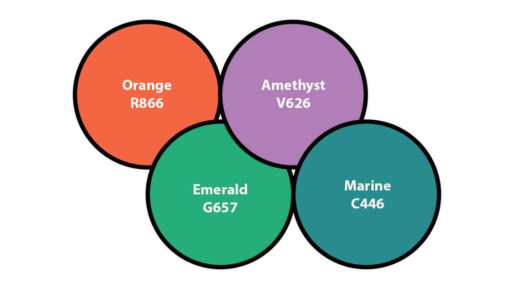 Orange (R866), Emerald (G657), Amethyst (V626), Marine (C446)