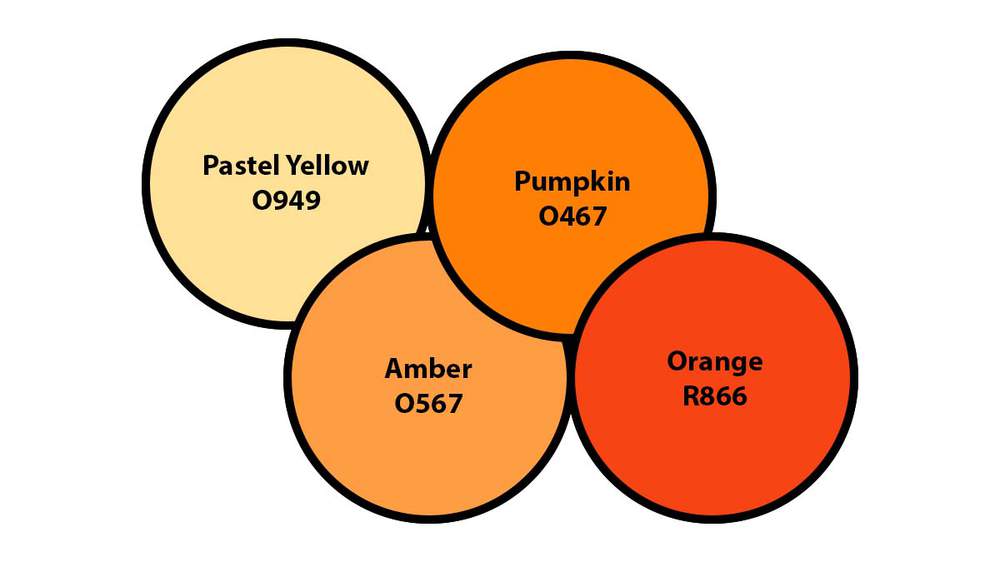 Pastel Yellow (O949) → Amber (O567) → Pumpkin (O467) → Orange (R866)