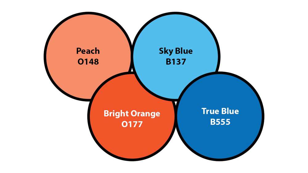 Peach (O148), Bright Orange (O177), Sky Blue (B137), True Blue (B555)